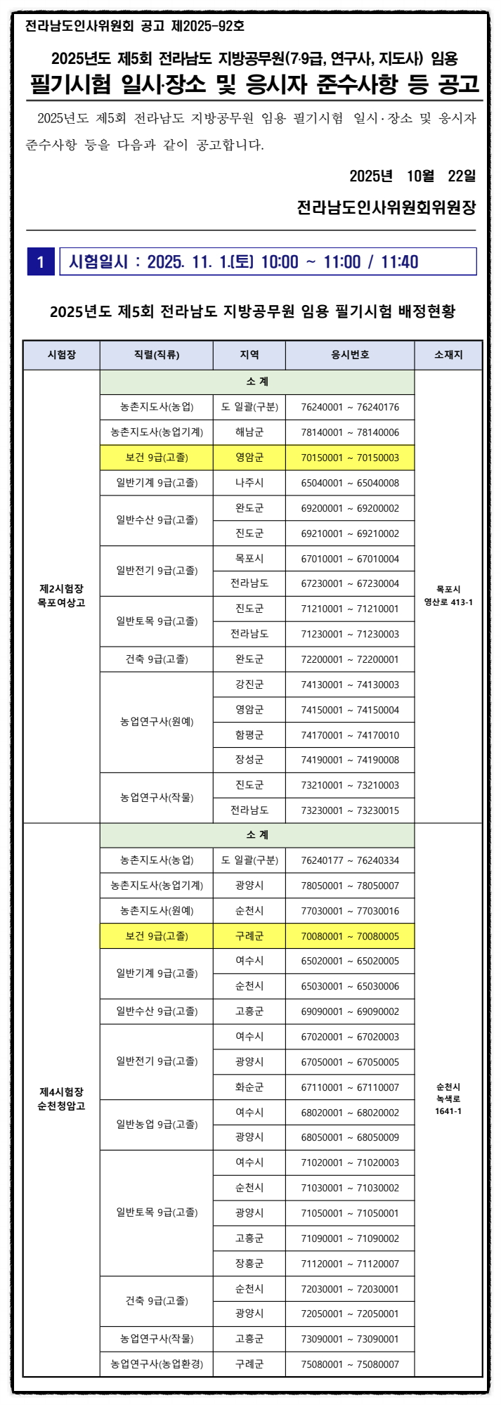 2025년도 제5회 전라남도 보건직(고졸) 공무원 임용 필기시험 장소 및 응시자 준수사항 등 공고