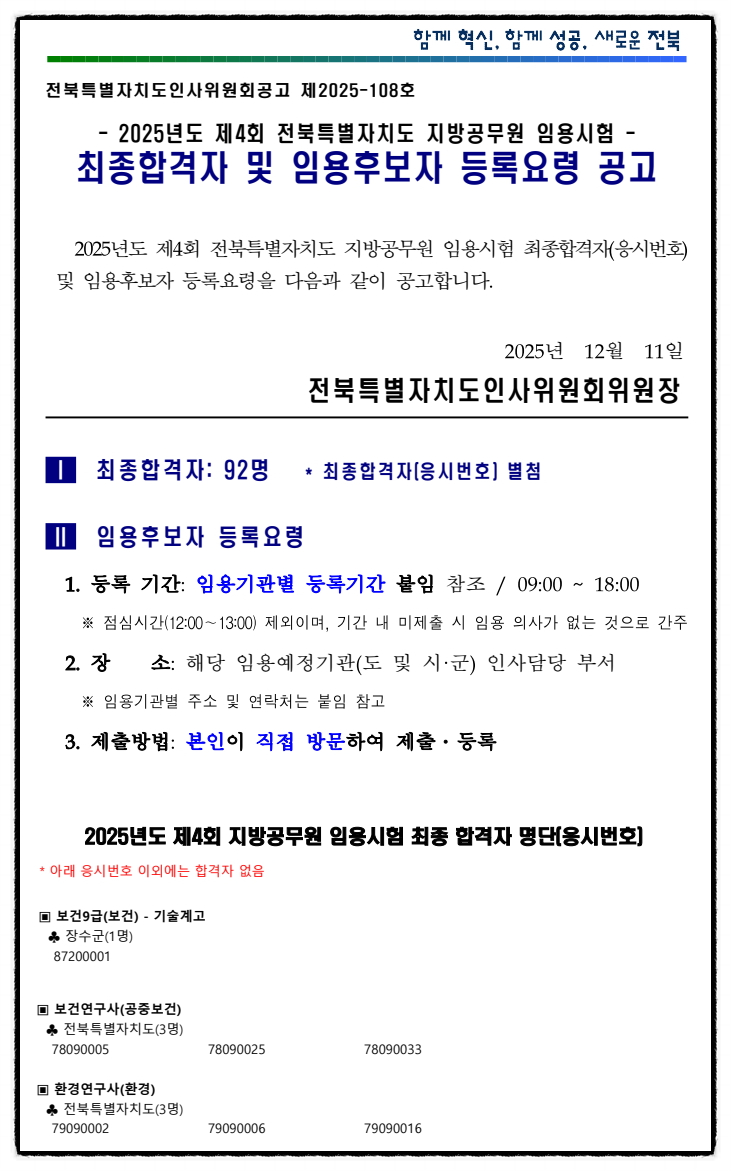 2025년도 제4회 전북특별자치도 보건직(고졸), 보건연구사, 환경연구사 지방공무원 임용시험 최종합격자 및 임용후보자 등록요령 공고