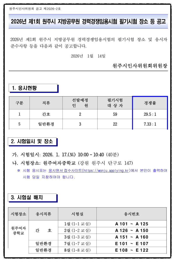 2026년도 제1회 강원특별자치도 원주시 간호직, 환경직 지방공무원 경력경쟁임용시험 필기시험 장소 공고