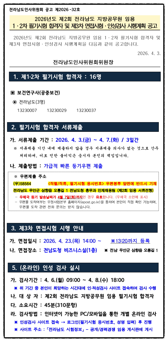 2026년도 제2회 전라남도 보건연구사 공무원 임용 필기시험 합격자 발표 및 면접시험·인성검사 시행계획 공고 [면접특강 안내]