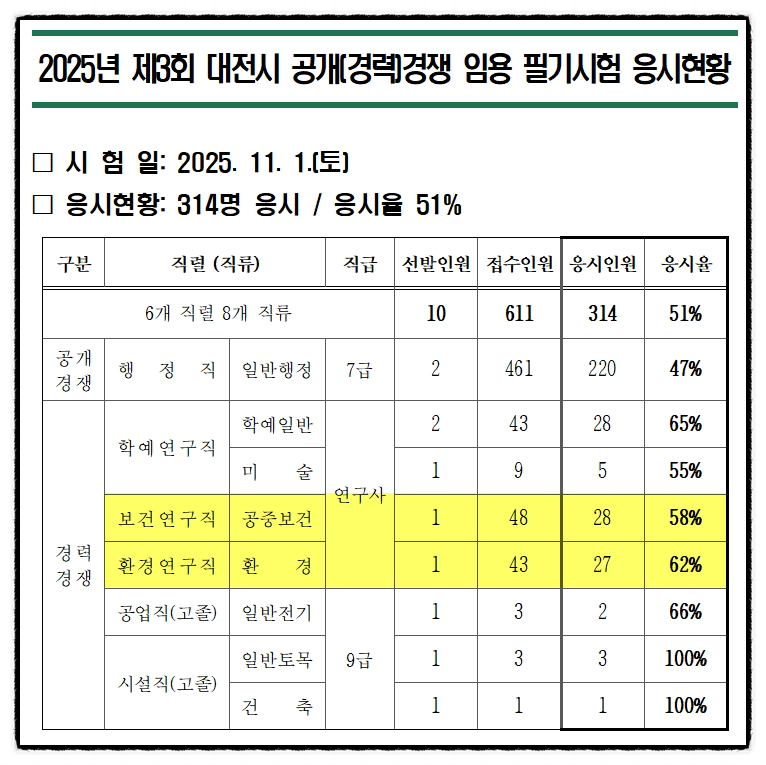 2025년 제3회 대전광역시 보건연구사, 환경연구사 경력경쟁 임용 필기시험 응시현황