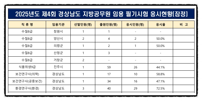 2025년도 제4회 경상남도 환경직, 식품위생직, 보건연구사, 환경연구사 지방공무원 임용 필기시험 응시현황 안내