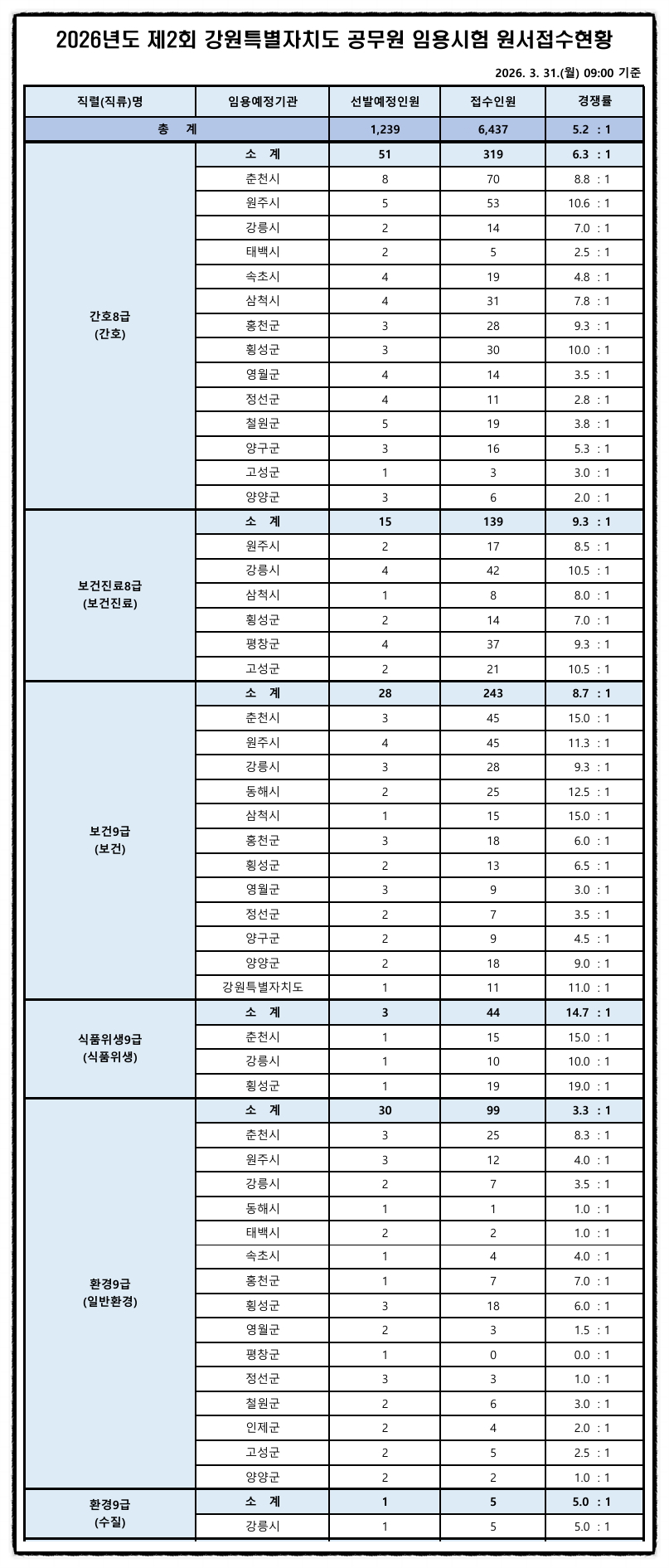 2026년도 제2회 강원특별자치도 간호직, 보건진료직, 보건직, 식품위생직, 환경직 공무원 임용시험 응시원서 접수현황 안내