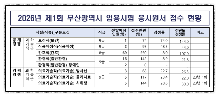 2026년도 제1회 부산광역시 보건직,식품위생직,간호직,환경직,의료기술직공무원 임용시험 응시원서 접수 현황