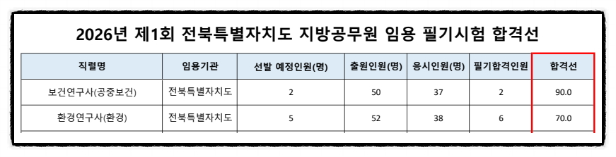 2026년도 제1회 전북특별자치도 보건연구사, 환경연구사 공무원 임용시험 필기시험 합격선