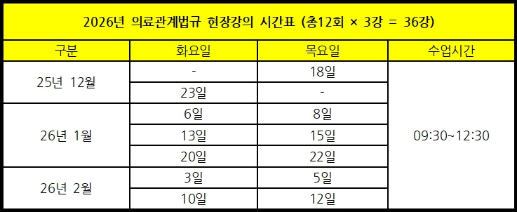 ▣ 2026 의료관계법규 특강 현장수업 진행 일정 및 시간표, 신청 방법