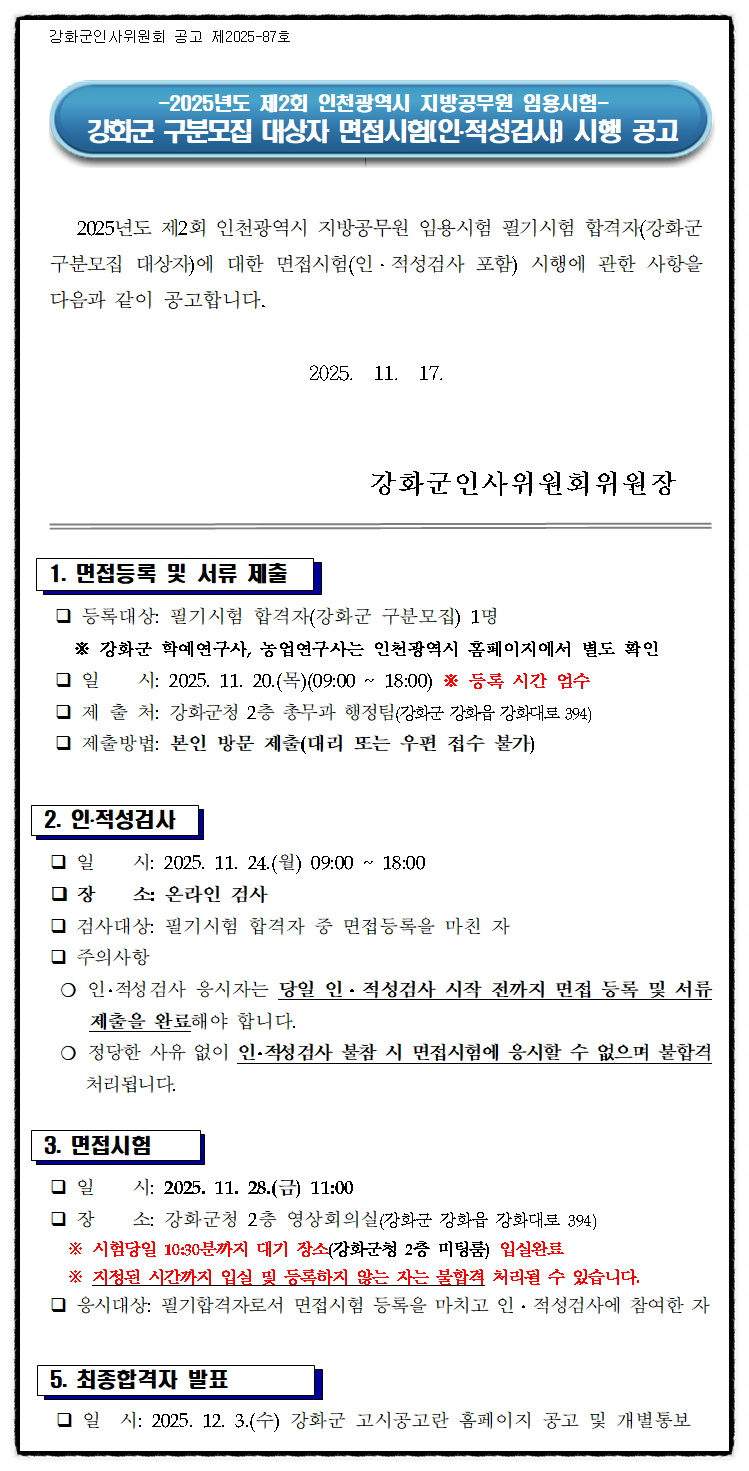2025년도 제2회 인천광역시(강화군 구분 모집) 의료기술직공무원 임용 필기시험 합격자 면접시험 시행계획 공고 [면접특강 안내]