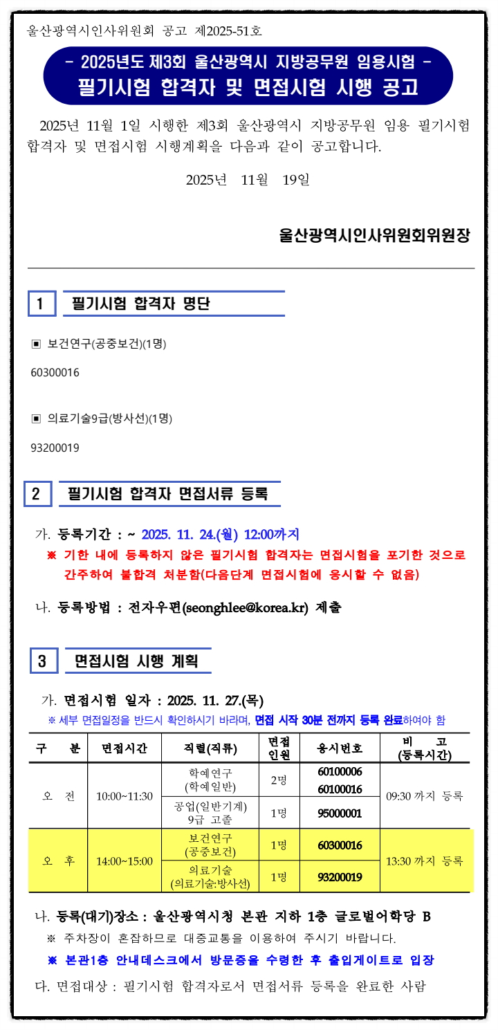 2025년도 제3회 울산광역시 보건연구사, 의료기술직 지방공무원 임용 필기시험 합격자 및 면접시험 시행 공고 [면접특강 안내]