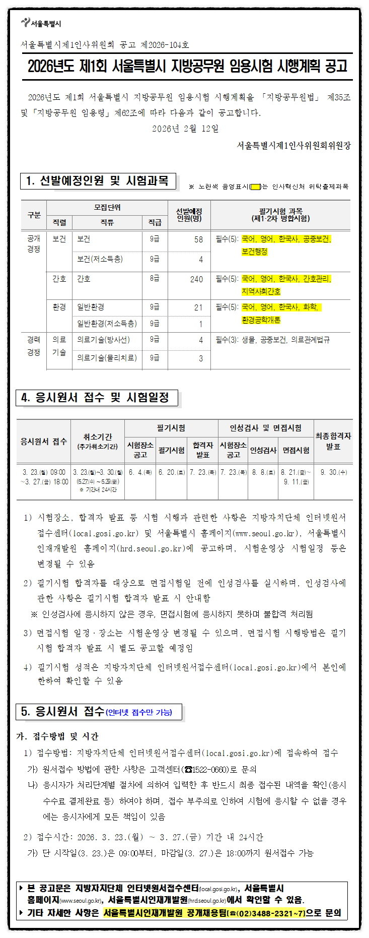 2026년도 제1회 서울특별시 지방공무원 임용시험 시행계획 공고 [보건직,간호직,환경직,의료기술직]