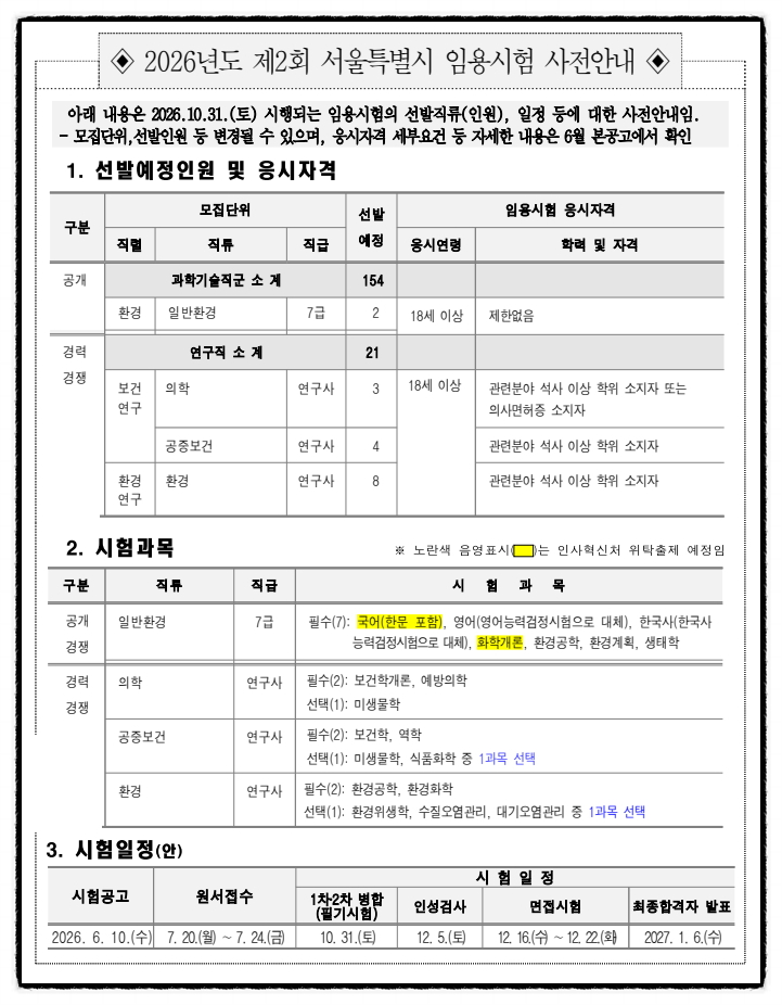2026년도 제2회 서울특별시 지방공무원 신규임용 시험일정 등 공고(사전 안내)[환경직7급, 보건연구사, 환경연구사]