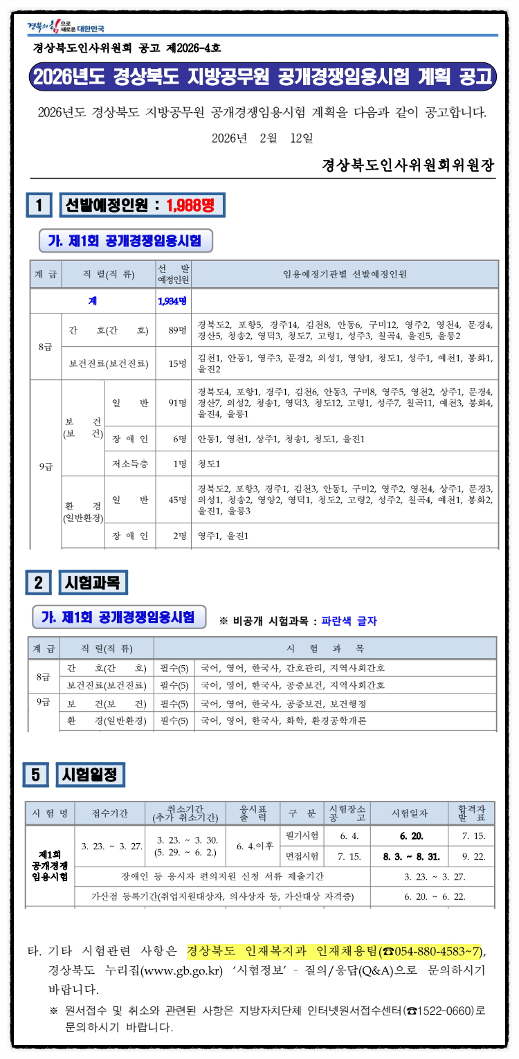 2026년도 경상북도 지방공무원 공개경쟁임용시험 계획 공고 [간호직,보건진료직,보건직,환경직]