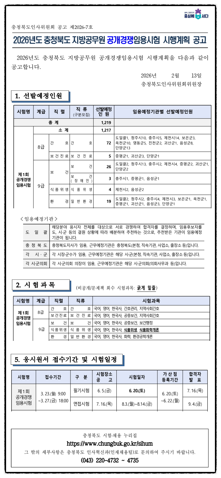 2026년도 충청북도 지방공무원 공개경쟁임용시험 시행계획 공고[간호,보건진료,보건,식품위생,환경]