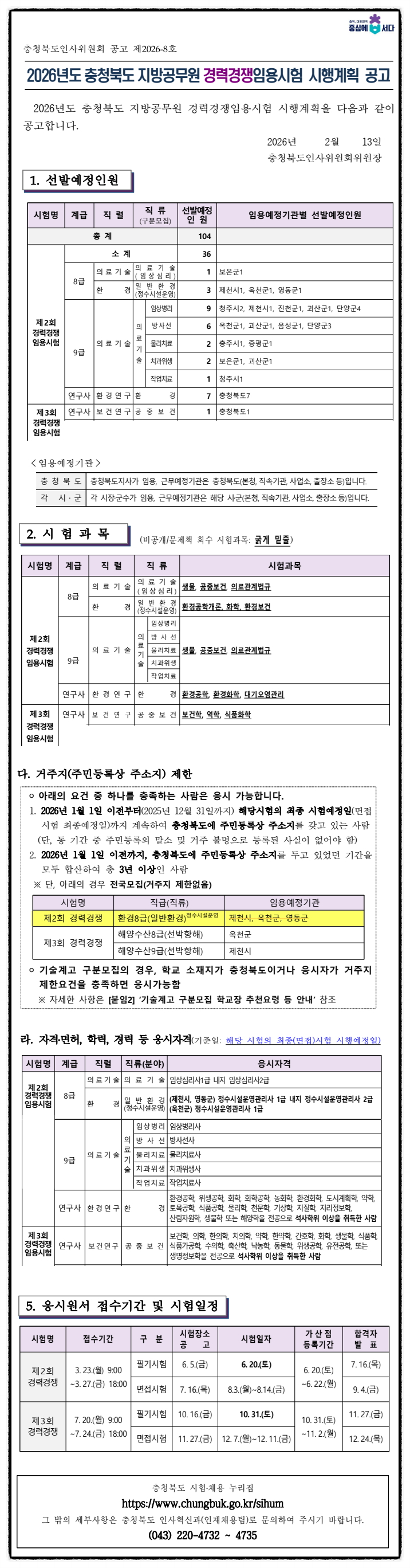 2026년도 충청북도 지방공무원 경력경쟁임용시험 시행계획 공고[의료기술직,환경직,환경연구사,보건연구사]