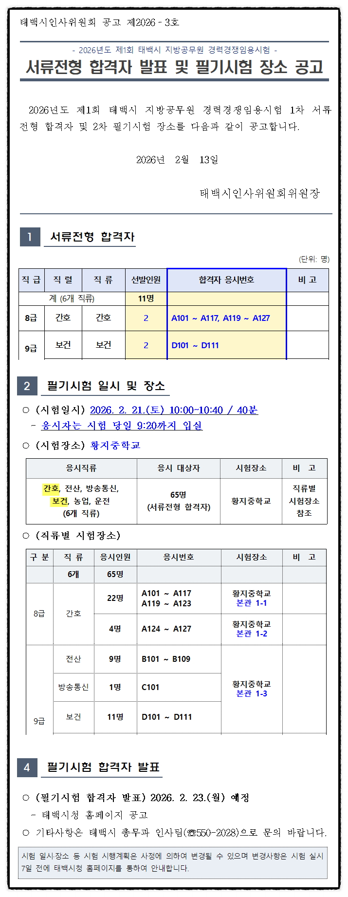2026년도 제1회 강원특별자치도 태백시 간호직, 보건직공무원 경력경쟁임용시험 서류전형 합격자 발표 및 필기시험 장소 공고