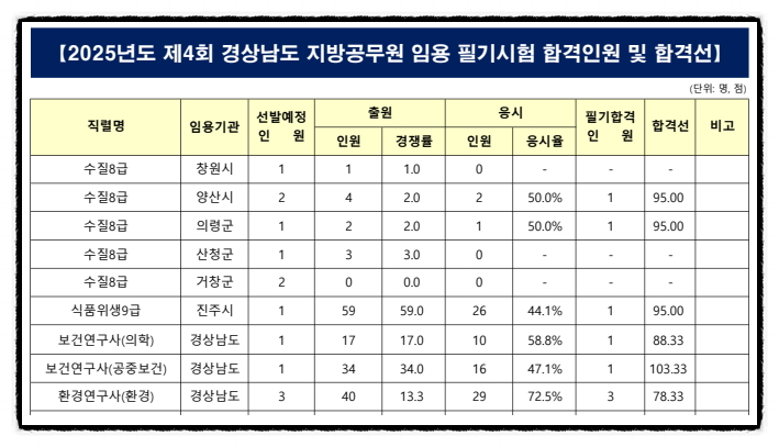 2025년도 제4회 경상남도 환경직, 식품위생직, 보건연구사, 환경연구사 지방공무원 임용 필기시험 합격선