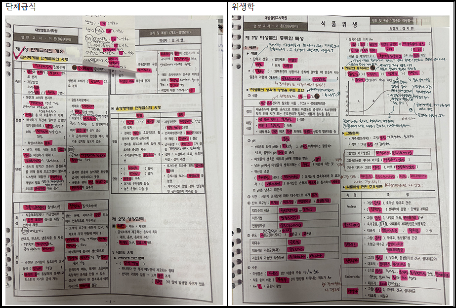 - 또한 이 시기부터는 본격적인 암기도 시작했어요. 자연스럽게 암기되는 내용을 제외하고, 저는 암기펜을 활용해 암기했습니다! 특히, 단체급식이나 위생학의 경우 단순암기가 많기 때문에 암기펜을 적극활용했고, 김지연 교수님의 자료를 많이 이용했습니다. 뿐만 아니라, 다른 과목도 암기해야 되는 건 암기펜을 활용해 암기했어요.