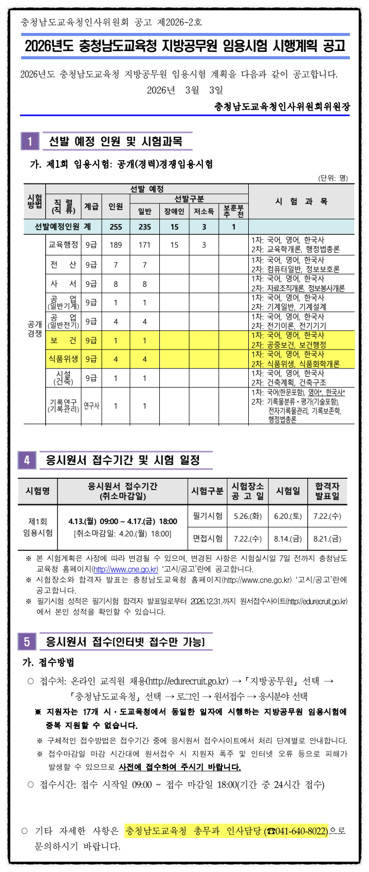 2026년도 충청남도교육청 지방공무원 임용시험 시행계획 공고[보건직1, 식품위생직4]
