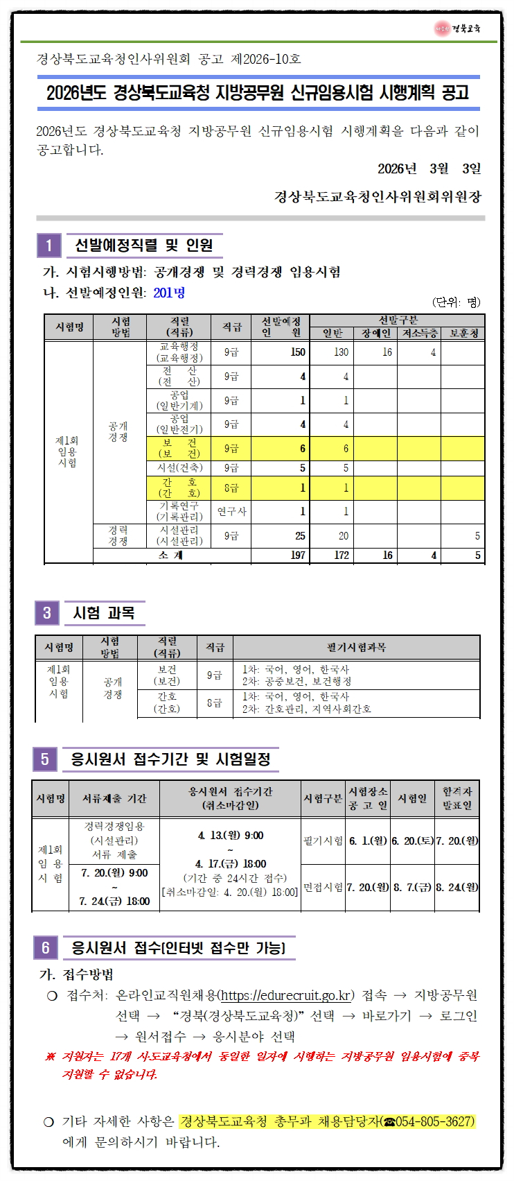 2026년도 경상북도교육청 지방공무원 임용시험 시행계획 공고[보건직6, 간호직1]