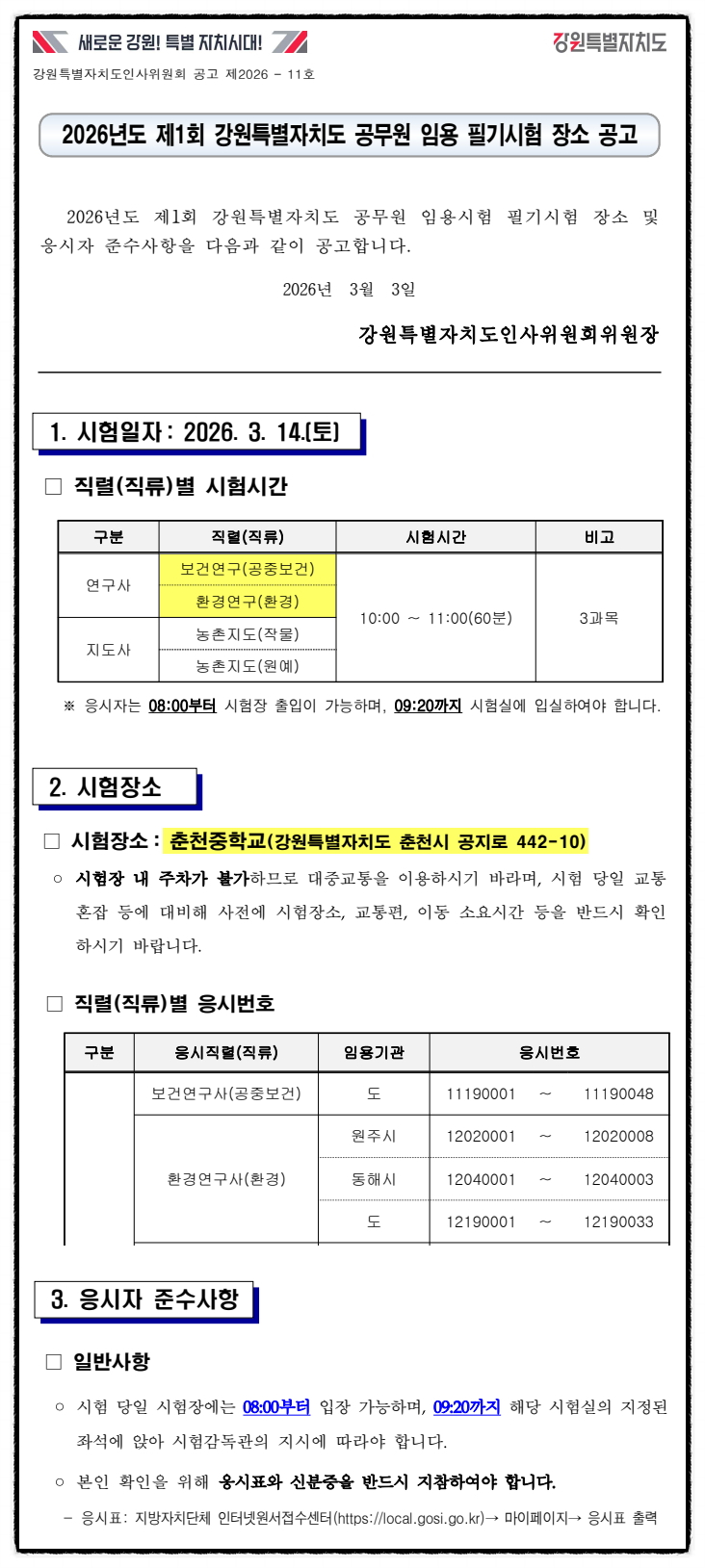 2026년도 제1회 강원특별자치도 보건연구사, 환경연구사 공무원 임용 필기시험 장소 공고