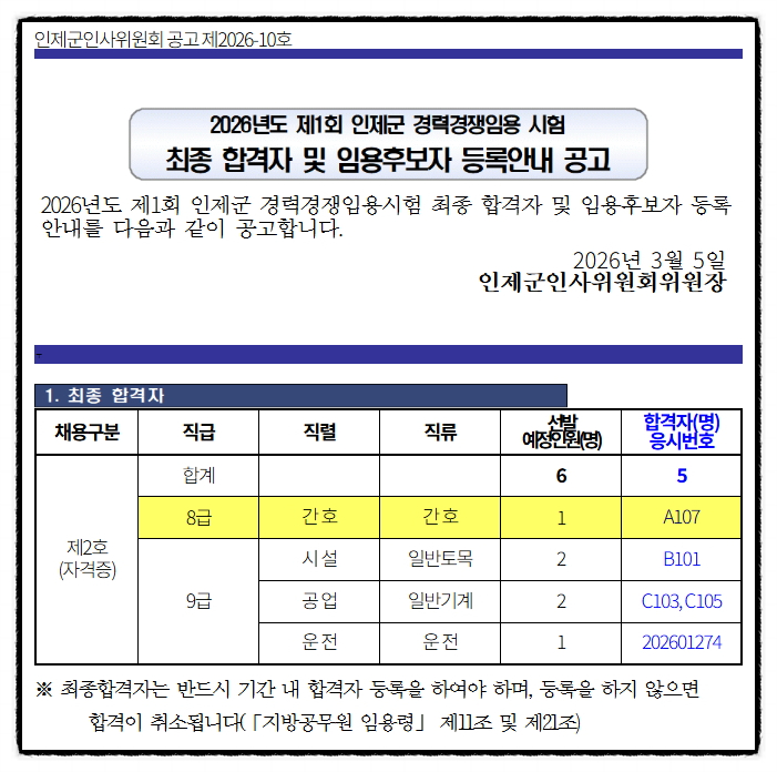2026년도 제1회 강원특별자치도 인제군 간호직 공무원 경력경쟁임용시험 최종 합격자 및 임용후보자 등록안내 공고