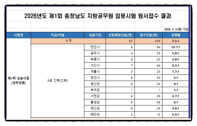 2026년도 제1회 충청남도 간호직공무원 임용시험 원서접수 결과 안내