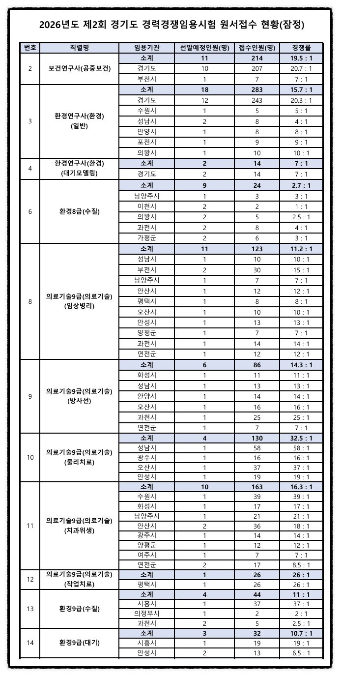 2026년도 제2회 경기도 보건연구사, 환경연구사, 환경직, 의료기술직 경력경쟁임용시험 원서접수 현황(잠정)