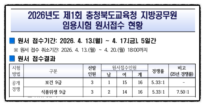 2026년도 제1회 충청북도교육청 보건직, 식품위생직공무원 공개경쟁임용시험 원서접수 결과 안내