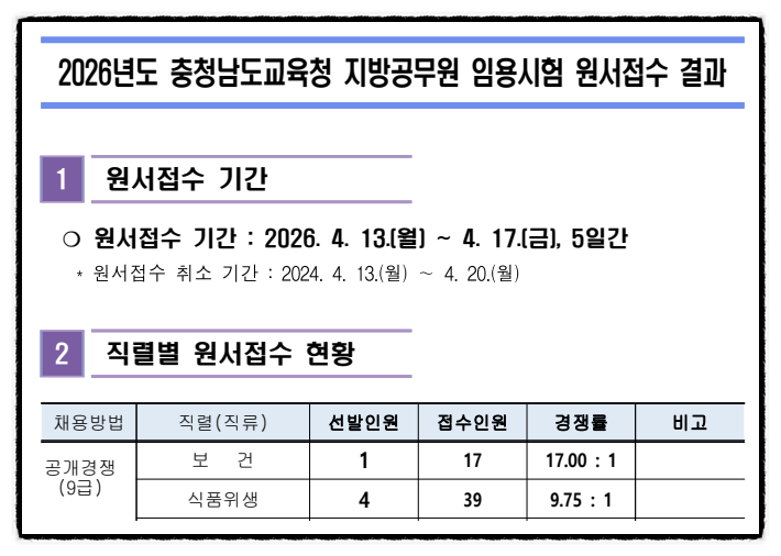 2026년도 충청남도교육청 보건직, 식품위생직공무원 임용시험 원서접수 결과 안내