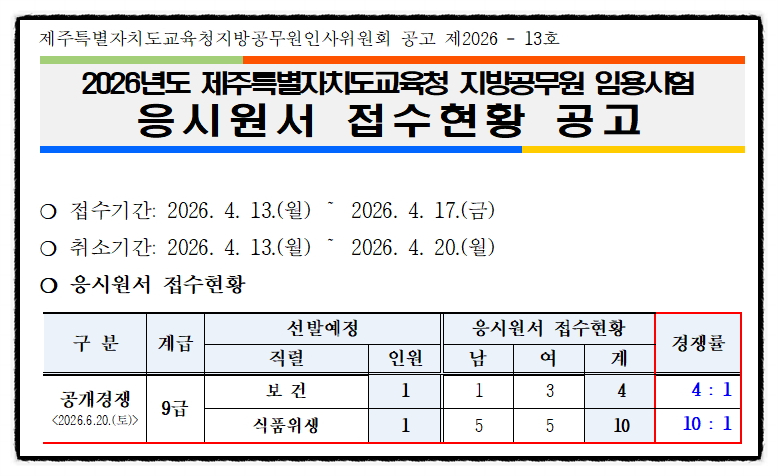 2026년도 제주특별자치도교육청 보건직, 식품위생직공무원 임용시험 응시원서 접수현황 공고