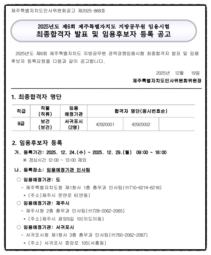 2025년 제6회 제주특별자치도 보건직(고졸) 지방공무원 임용시험 최종합격자 발표 및 임용후보자 등록 공고