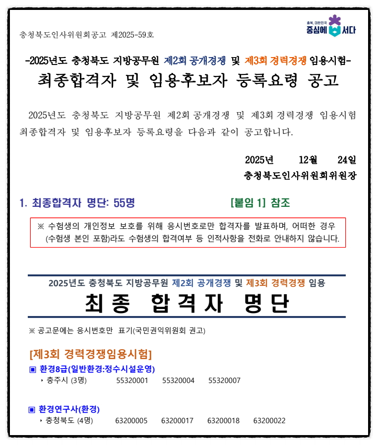 2025년도 충청북도 8급환경직, 환경연구사 지방공무원 제3회 경력경쟁임용시험 최종합격자 및 임용후보자 등록요령 공고