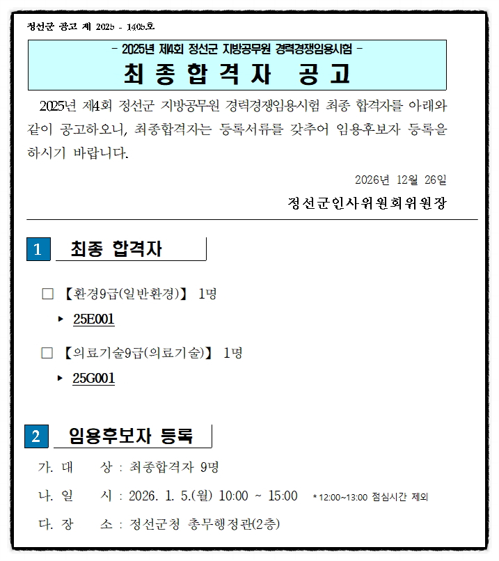 2025년 제4회 강원특별자치도 정선군 환경직, 의료기술직 지방공무원 경력경쟁임용시험 최종합격자 공고