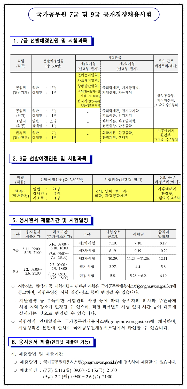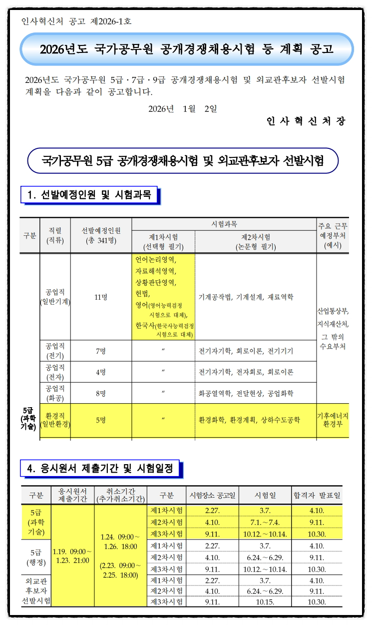2026년도 국가공무원 공개경쟁채용시험 등 계획 공고[환경직 5급 5, 7급 7, 장애1, 9급 21, 장애2, 저소득1]