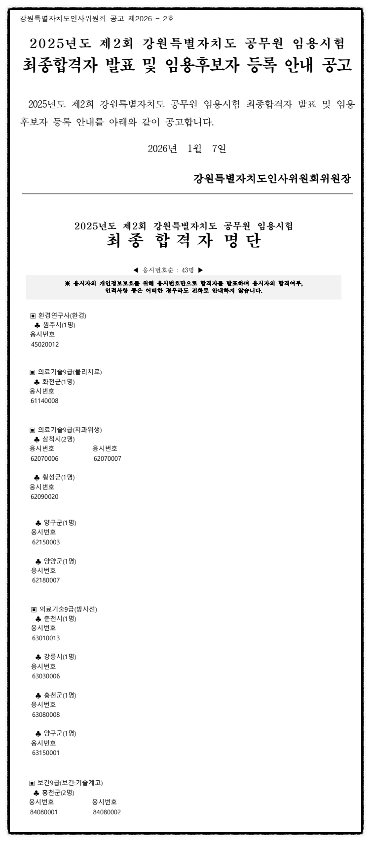 2025년도 제2회 강원특별자치도 환경연구사, 의료기술직, 보건직(고졸)공무원 임용시험 최종합격자 발표 및 임용후보자 등록 안내 공고