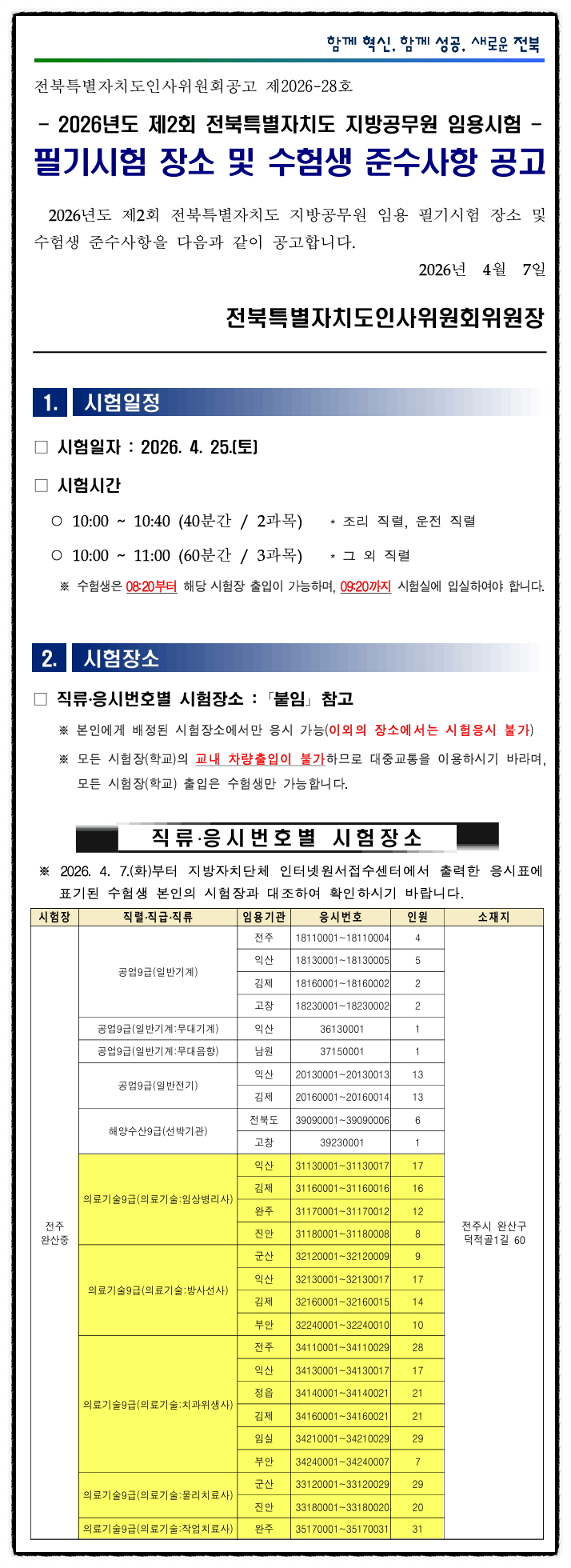 2026년도 제2회 전북특별자치도 의료기술직 공무원 임용 필기시험 장소 및 수험생 준수사항 공고