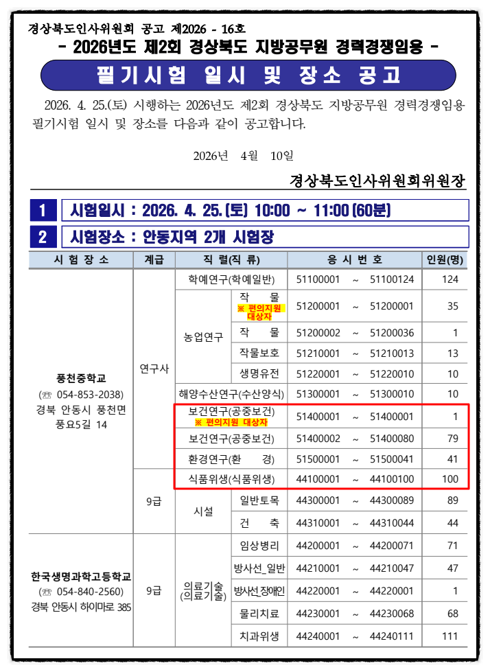 2026년도 경상북도 보건연구사, 환경연구사, 식품위생직, 의료기술직공무원 제2회 경력경쟁임용 필기시험 일시 및 장소 공고
