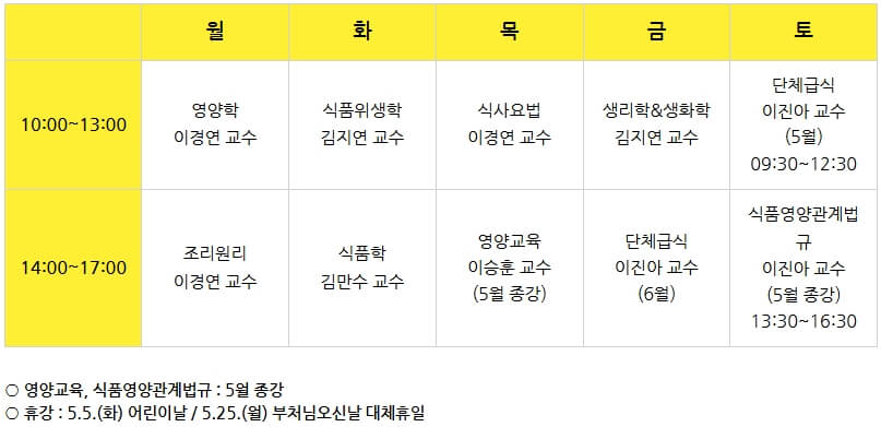8주 완성으로 진행되는 현장강의 시간표는 아래와 같습니다. 식품영양학과에서 배우는 내용들 중 영양사 합격에 꼭 필요한 내용을 선별하여 압축 진행되는 수업입니다. 기초가 전혀 없는 분들도 충분히 따라올 수 있도록 교재, 강의가 구성되어 있습니다.